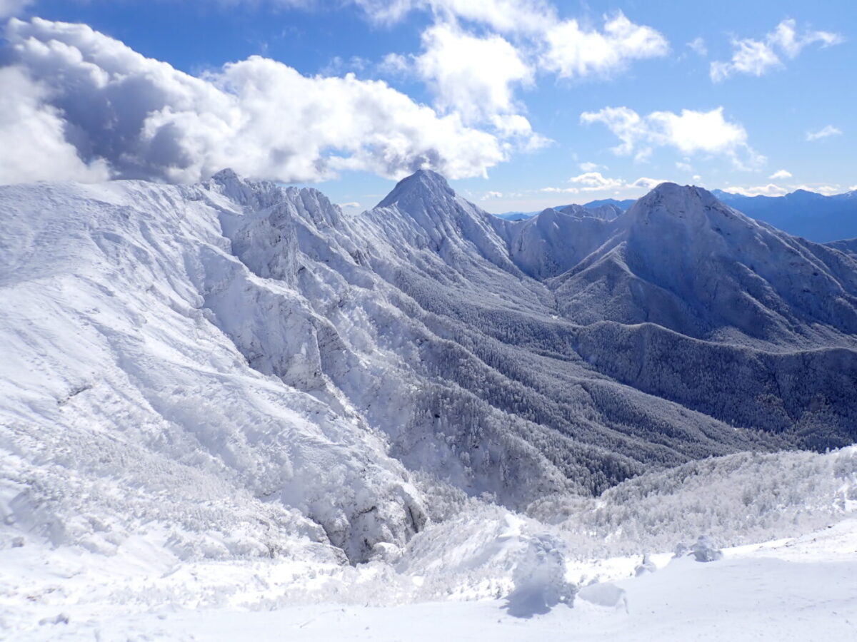 冬の南八ヶ岳は赤岳や横岳など険しい岩山に目が行きがちですが、南八ヶ岳の最北、硫黄岳は入門者にうってつけ!初日は赤岳鉱泉に泊まり、翌日硫黄岳を往復します。樹林帯を抜ければ岩場をアイゼンで歩いたり、雪面をピッケルをうまく使いながらトラバースしたりとバリエーション豊富です。