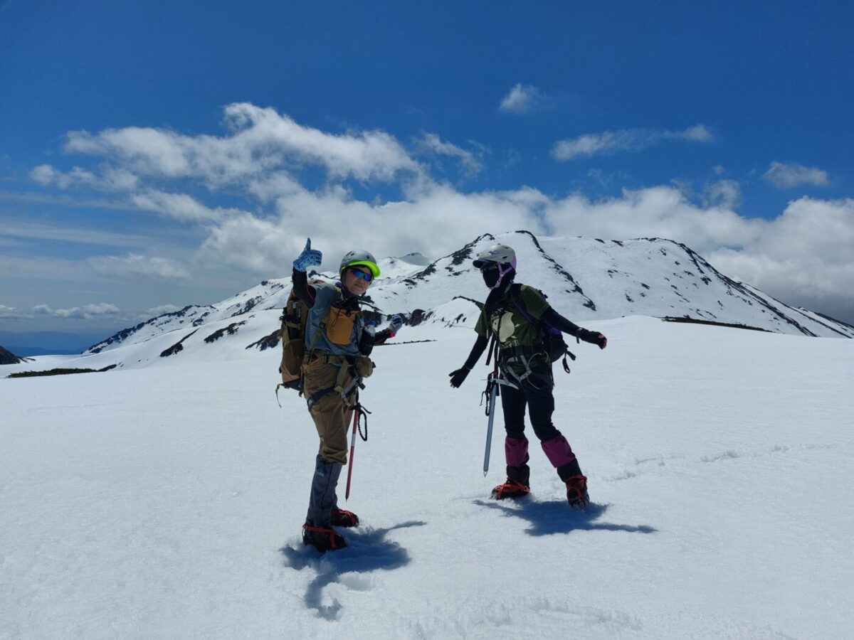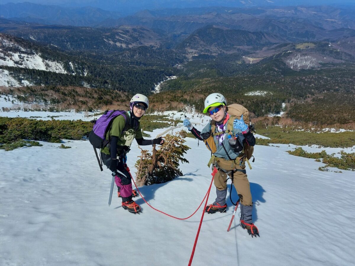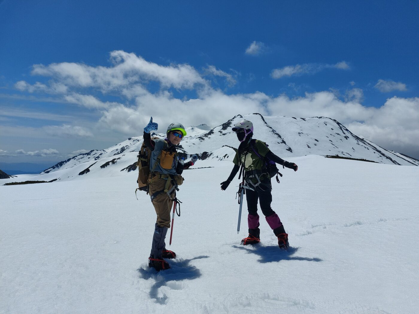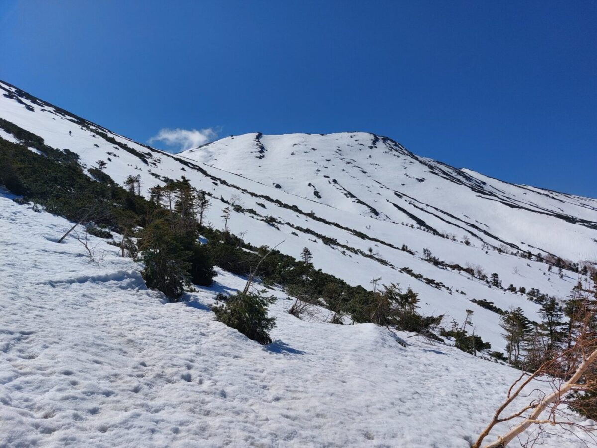 残雪期は登りやすいとはいえ森林限界より上部は急傾斜!登り下り共にしっかりとしたアイゼン・ピッケルワークが必要になります。冬の間しっかりとした技術を身につけてチャレンジしたい一座です。